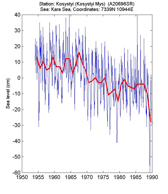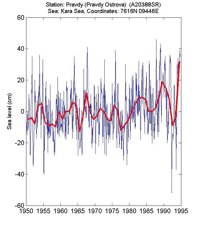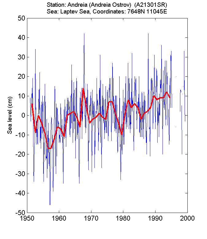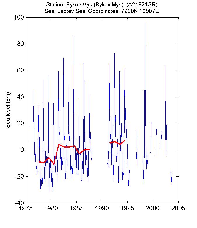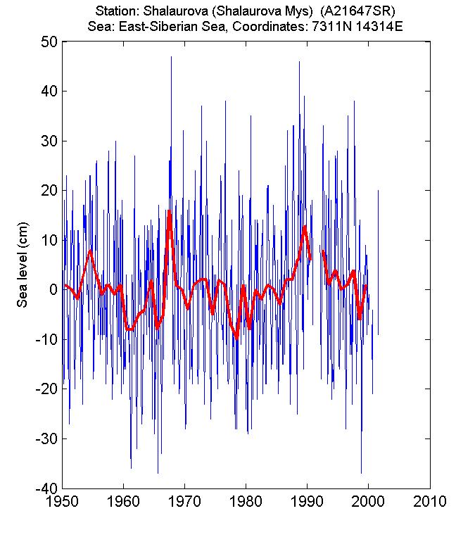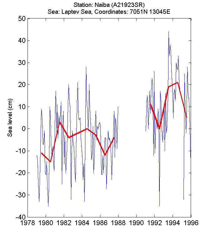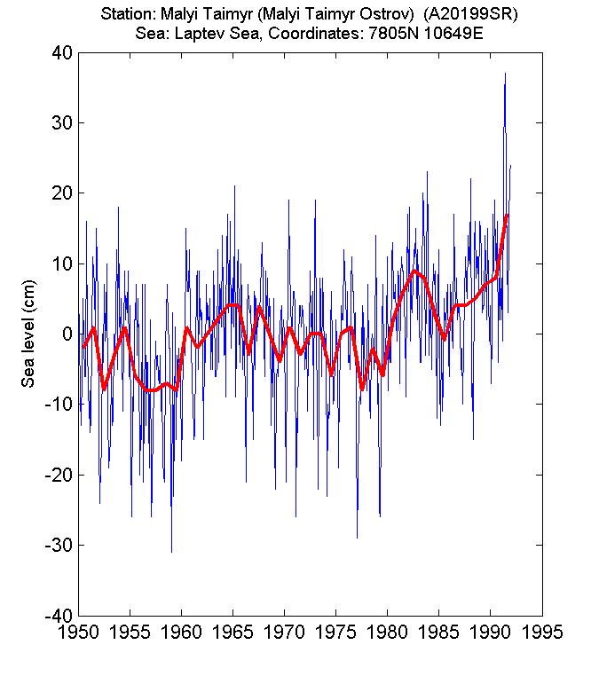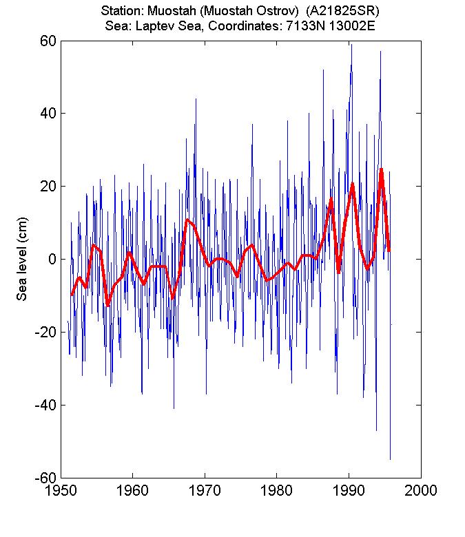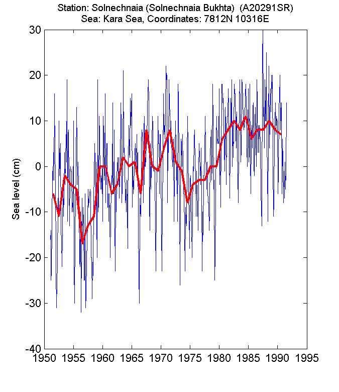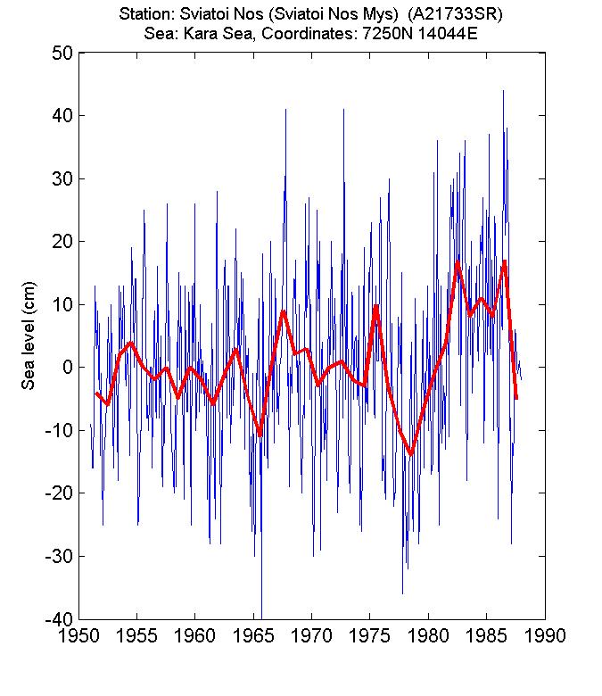 Click on a magenta station number to see a plot of the monthly mean sea level (blue) and annual mean sea level (red). Back to main data map.