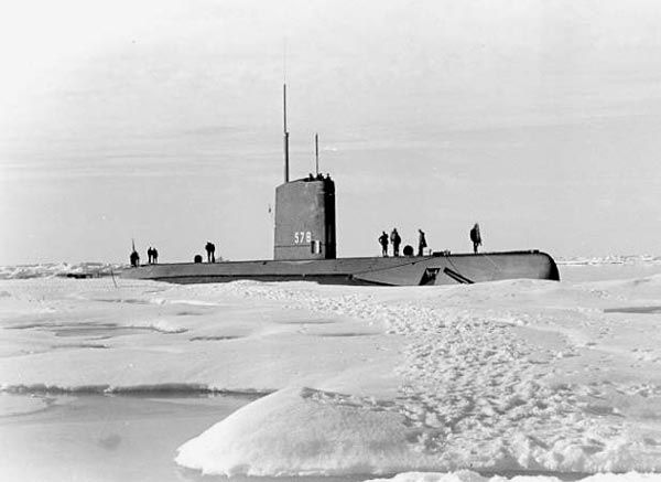 USS SKATE (SSN 578), CDR James F. Calvert, first thru ice surfacing at the North Pole (Dr. W.K. Lyon and Richard Boyle).