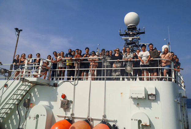 The TN-445 science party aboard the R/V Thompson, on a beautiful sunny day during a break in the monsoon! Image courtesy of Katy Abbott.