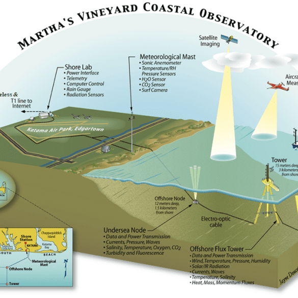 Schematic drawing of MVCO’s assets, the Air-Sea Interaction Tower, Offshore Node, Meteorological Mast, and Shore Lab. The Martha’s Vineyard Coastal Observatory 2021: State of the Observatory Report gives an overview of the 20 year history of the observatory and outlines possible paths for the future of MVCO and its assets. Photo credit courtesy of Jayne Doucette/WHOI Graphics.
